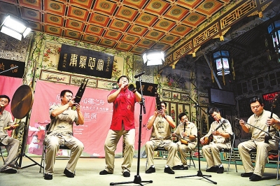7月22日,非遺傳承人杜杏栓(右五)吹奏嗩吶。當(dāng)日,“山西忻州文化遺產(chǎn)精品展示月”系列活動在北京恭王府開幕。新華社發(fā)